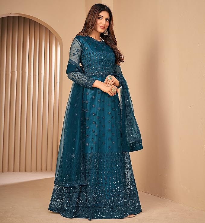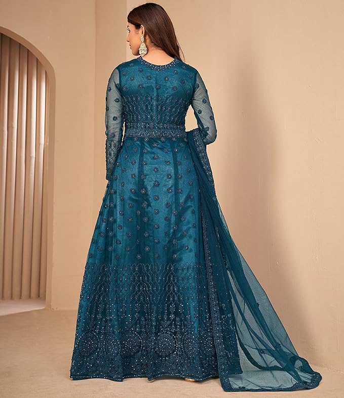 Divine International Trading Co Women’s Net with Heavy Embroidery Work Long Anarkali